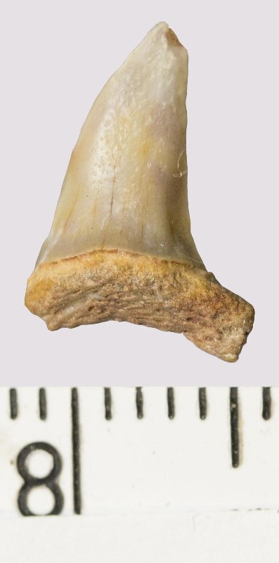 Зуб (фрагмент). Акула. Odontaspis venusta (Leriche, 1929). Классификация: Хордовые Chordata, Позвоночные Vertebrata, Хрящевые рыбы Chondrichthyes, Пластиножаберные Elasmobranchii