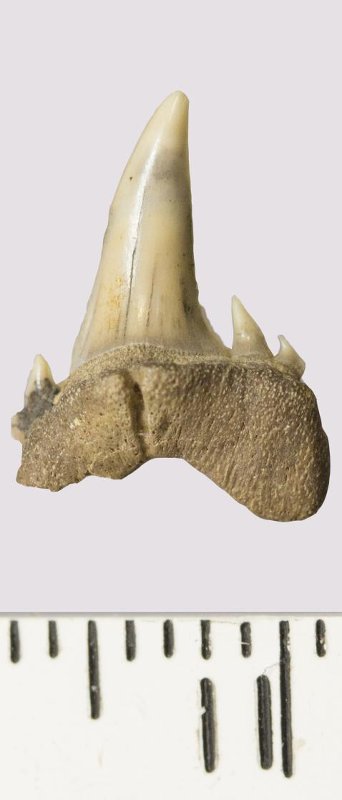 Зуб. Акула. Odontaspis venusta (Leriche, 1929). Классификация: Хордовые Chordata, Позвоночные Vertebrata, Хрящевые рыбы Chondrichthyes, Пластиножаберные Elasmobranchii
