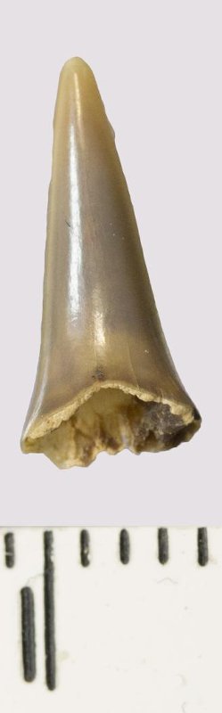 Зуб (фрагмент). Акула. Odontaspis venusta (Leriche, 1929). Классификация: Хордовые Chordata, Позвоночные Vertebrata, Хрящевые рыбы Chondrichthyes, Пластиножаберные Elasmobranchii