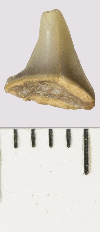 Зуб (фрагмент). Акула. Odontaspis venusta (Leriche, 1929). Классификация: Хордовые Chordata, Позвоночные Vertebrata, Хрящевые рыбы Chondrichthyes, Пластиножаберные Elasmobranchii
