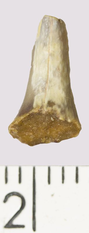 Зуб (фрагмент). Акула. Odontaspis venusta (Leriche, 1929). Классификация: Хордовые Chordata, Позвоночные Vertebrata, Хрящевые рыбы Chondrichthyes, Пластиножаберные Elasmobranchii