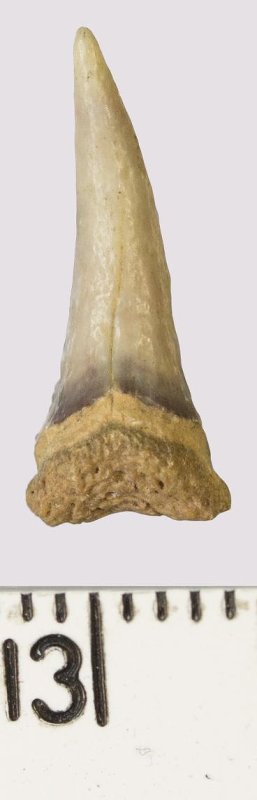 Зуб (фрагмент). Акула. Odontaspis venusta (Leriche, 1929). Классификация: Хордовые Chordata, Позвоночные Vertebrata, Хрящевые рыбы Chondrichthyes, Пластиножаберные Elasmobranchii