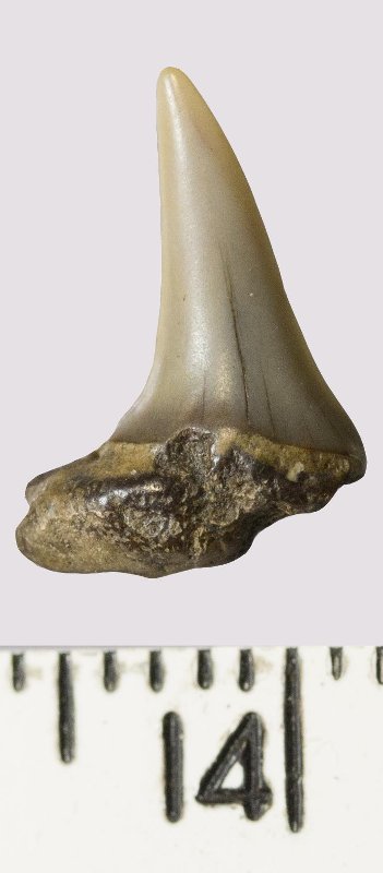 Зуб (фрагмент). Акула. Odontaspis venusta (Leriche, 1929). Классификация: Хордовые Chordata, Позвоночные Vertebrata, Хрящевые рыбы Chondrichthyes, Пластиножаберные Elasmobranchii