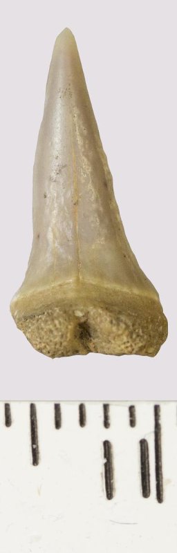 Зуб (фрагмент). Акула. Odontaspis venusta (Leriche, 1929). Классификация: Хордовые Chordata, Позвоночные Vertebrata, Хрящевые рыбы Chondrichthyes, Пластиножаберные Elasmobranchii
