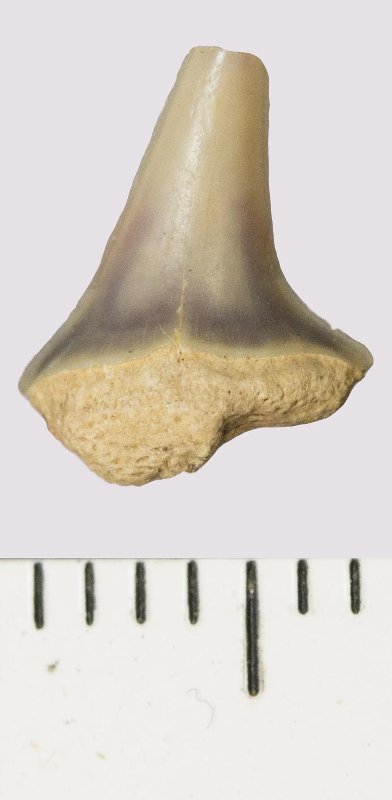 Зуб (фрагмент). Акула. Odontaspis venusta (Leriche, 1929). Классификация: Хордовые Chordata, Позвоночные Vertebrata, Хрящевые рыбы Chondrichthyes, Пластиножаберные Elasmobranchii