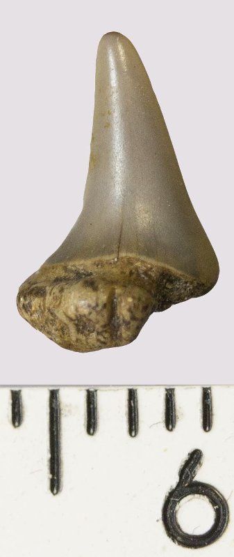 Зуб (фрагмент). Акула. Odontaspis venusta (Leriche, 1929). Классификация: Хордовые Chordata, Позвоночные Vertebrata, Хрящевые рыбы Chondrichthyes, Пластиножаберные Elasmobranchii
