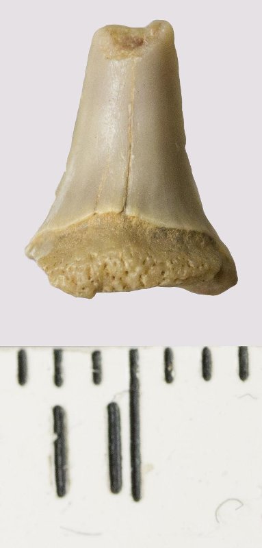 Зуб (фрагмент). Акула. Odontaspis venusta (Leriche, 1929). Классификация: Хордовые Chordata, Позвоночные Vertebrata, Хрящевые рыбы Chondrichthyes, Пластиножаберные Elasmobranchii