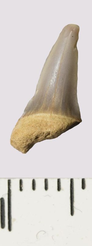 Зуб (фрагмент). Акула. Odontaspis venusta (Leriche, 1929). Классификация: Хордовые Chordata, Позвоночные Vertebrata, Хрящевые рыбы Chondrichthyes, Пластиножаберные Elasmobranchii