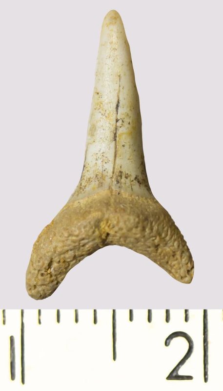 Зуб. Акула. Odontaspis venusta (Leriche, 1929). Классификация: Хордовые Chordata, Позвоночные Vertebrata, Хрящевые рыбы Chondrichthyes, Пластиножаберные Elasmobranchii
