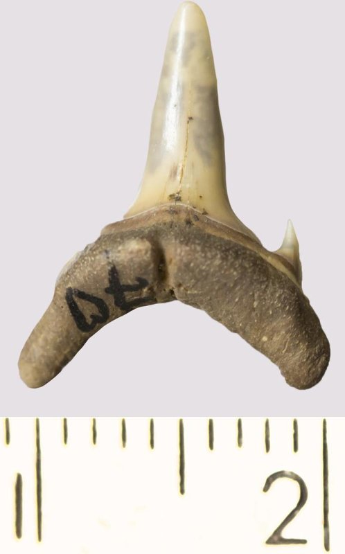 Зуб. Акула. Odontaspis venusta (Leriche, 1929). Классификация: Хордовые Chordata, Позвоночные Vertebrata, Хрящевые рыбы Chondrichthyes, Пластиножаберные Elasmobranchii