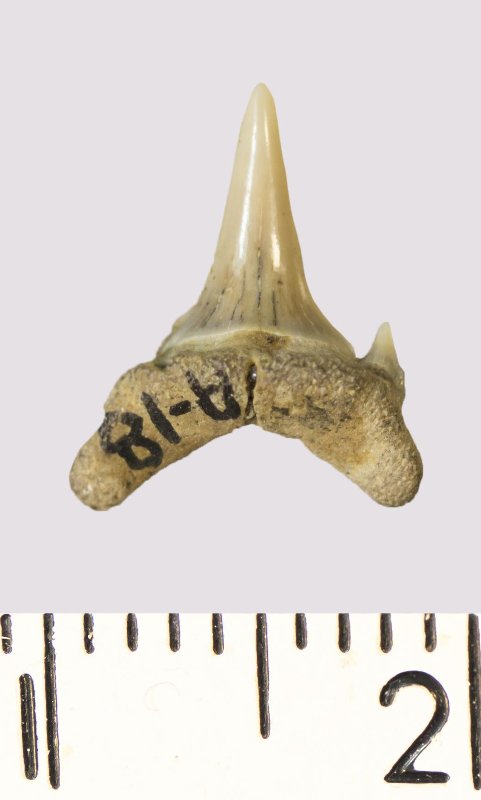 Зуб. Акула. Odontaspis venusta (Leriche, 1929). Классификация: Хордовые Chordata, Позвоночные Vertebrata, Хрящевые рыбы Chondrichthyes, Пластиножаберные Elasmobranchii