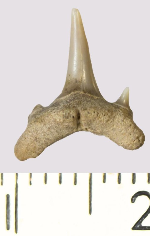 Зуб. Акула. Odontaspis venusta (Leriche, 1929). Классификация: Хордовые Chordata, Позвоночные Vertebrata, Хрящевые рыбы Chondrichthyes, Пластиножаберные Elasmobranchii