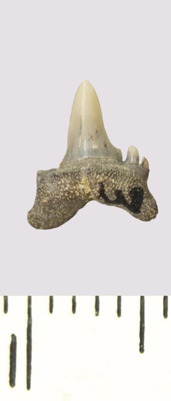 Зуб. Акула. Odontaspis venusta (Leriche, 1929). Классификация: Хордовые Chordata, Позвоночные Vertebrata, Хрящевые рыбы Chondrichthyes, Пластиножаберные Elasmobranchii