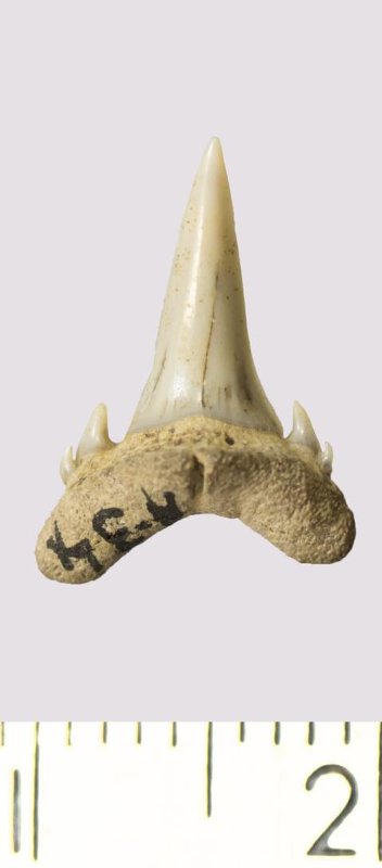 Зуб. Акула. Odontaspis venusta (Leriche, 1929). Классификация: Хордовые Chordata, Позвоночные Vertebrata, Хрящевые рыбы Chondrichthyes, Пластиножаберные Elasmobranchii
