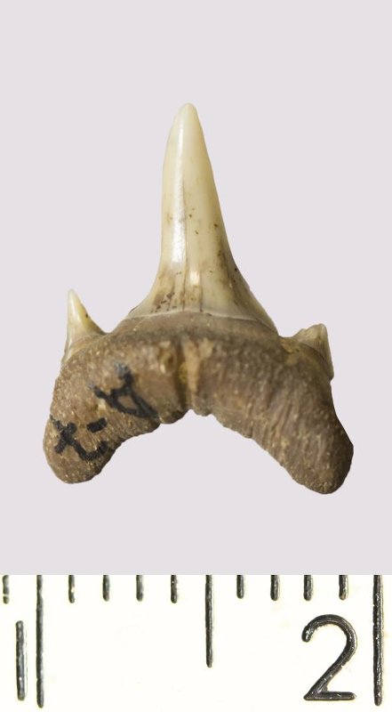 Зуб. Акула. Odontaspis venusta (Leriche, 1929). Классификация: Хордовые Chordata, Позвоночные Vertebrata, Хрящевые рыбы Chondrichthyes, Пластиножаберные Elasmobranchii