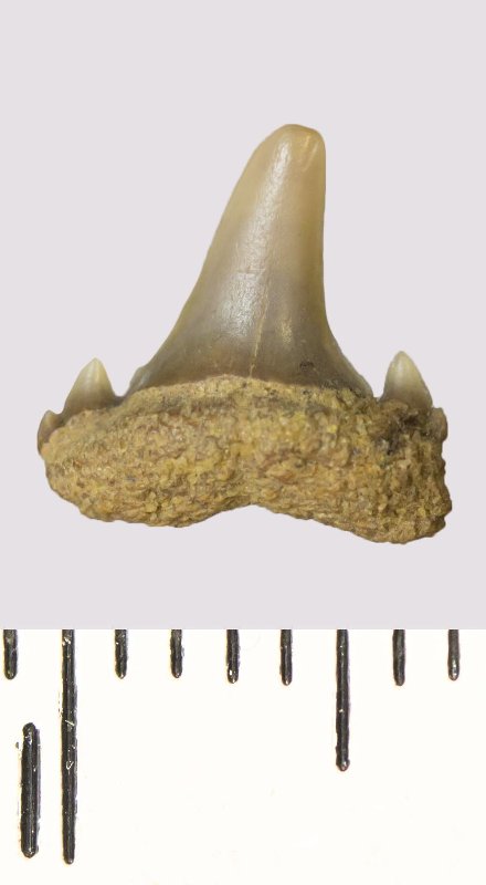 Зуб. Акула. Odontaspis venusta (Leriche, 1929). Классификация: Хордовые Chordata, Позвоночные Vertebrata, Хрящевые рыбы Chondrichthyes, Пластиножаберные Elasmobranchii