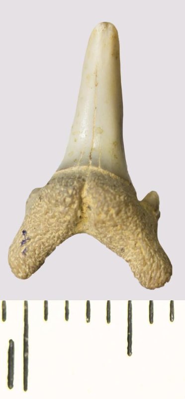 Зуб. Акула. Odontaspis venusta (Leriche, 1929). Классификация: Хордовые Chordata, Позвоночные Vertebrata, Хрящевые рыбы Chondrichthyes, Пластиножаберные Elasmobranchii