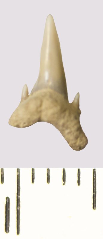 Зуб. Акула. Odontaspis venusta (Leriche, 1929). Классификация: Хордовые Chordata, Позвоночные Vertebrata, Хрящевые рыбы Chondrichthyes, Пластиножаберные Elasmobranchii