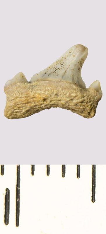 Зуб. Акула. Odontaspis venusta (Leriche, 1929). Классификация: Хордовые Chordata, Позвоночные Vertebrata, Хрящевые рыбы Chondrichthyes, Пластиножаберные Elasmobranchii