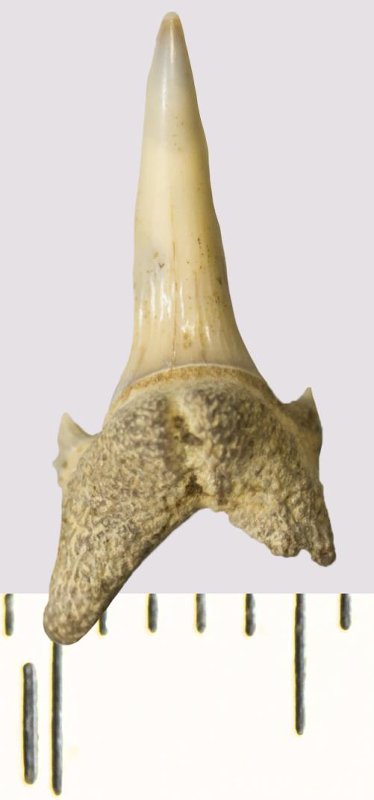 Зуб. Акула. Odontaspis venusta (Leriche, 1929). Классификация: Хордовые Chordata, Позвоночные Vertebrata, Хрящевые рыбы Chondrichthyes, Пластиножаберные Elasmobranchii
