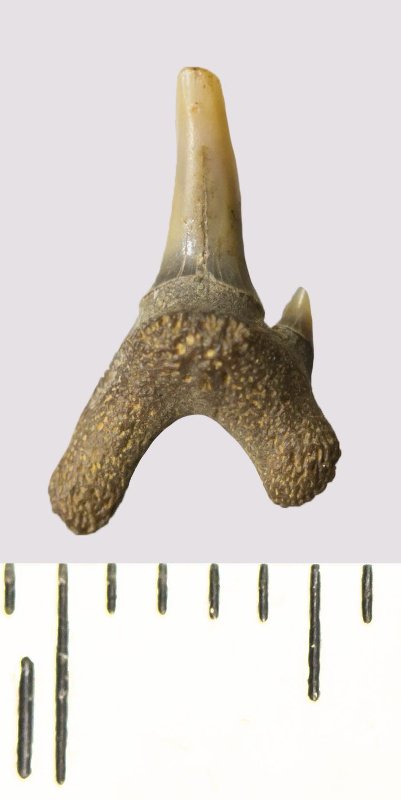 Зуб. Акула. Odontaspis macrorhiza (Cope) Leriche, 1902. Классификация: Хордовые Chordata, Позвоночные Vertebrata, Хрящевые рыбы Chondrichthyes, Пластиножаберные Elasmobranchii