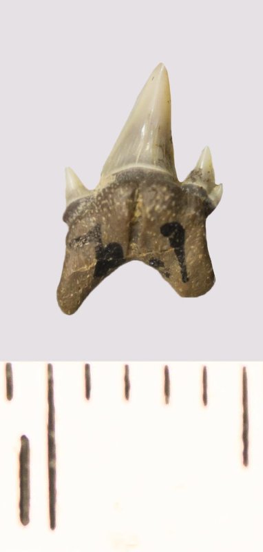 Зуб. Акула. Odontaspis macrorhiza (Cope) Leriche, 1902. Классификация: Хордовые Chordata, Позвоночные Vertebrata, Хрящевые рыбы Chondrichthyes, Пластиножаберные Elasmobranchii