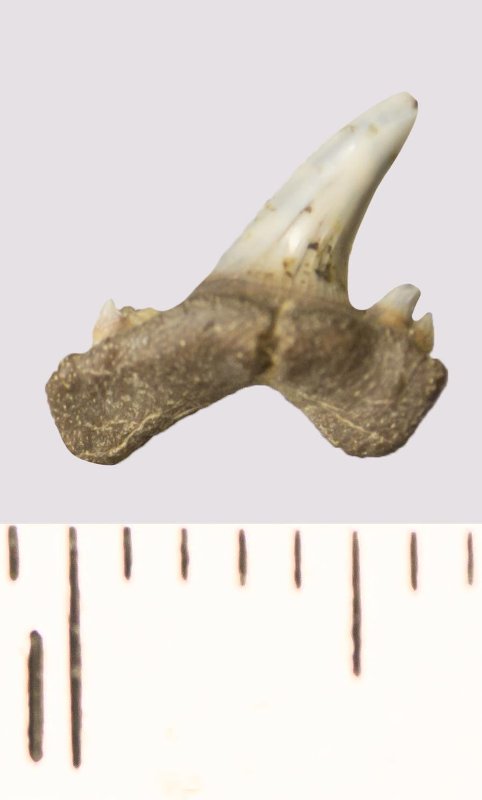 Зуб. Акула. Scapanorhynchus sp. Классификация: Хордовые Chordata, Позвоночные Vertebrata, Хрящевые рыбы Chondrichthyes, Пластиножаберные Elasmobranchii