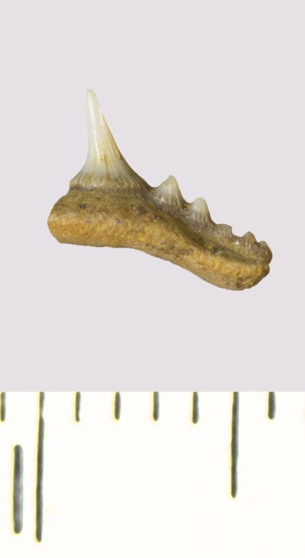 Зуб. Акула. Synechodus sp. Классификация: Хордовые Chordata, Позвоночные Vertebrata, Хрящевые рыбы Chondrichthyes, Пластиножаберные Elasmobranchii
