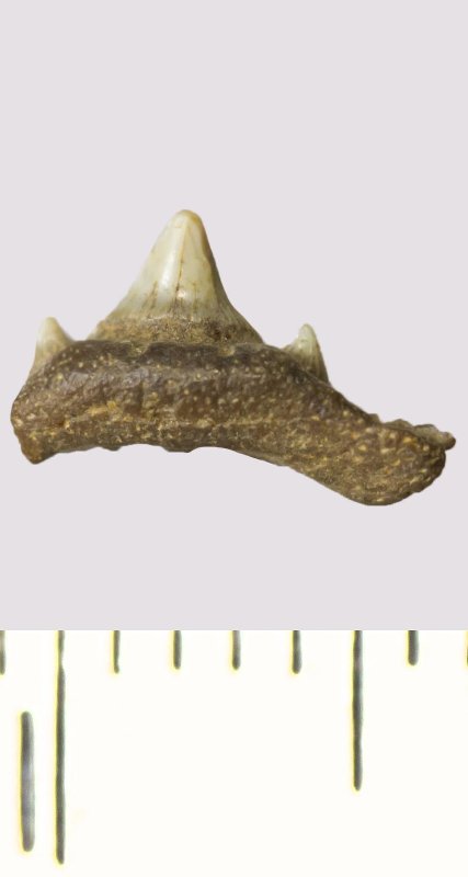 Зуб. Акула. Synechodus sp. Классификация: Хордовые Chordata, Позвоночные Vertebrata, Хрящевые рыбы Chondrichthyes, Пластиножаберные Elasmobranchii