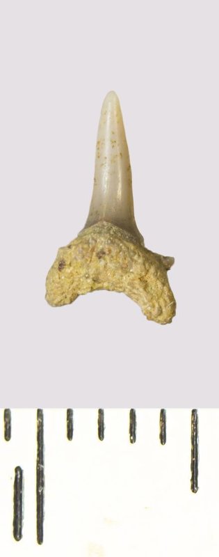 Зуб. Акула. Odontaspis venusta (Leriche, 1929). Классификация: Хордовые Chordata, Позвоночные Vertebrata, Хрящевые рыбы Chondrichthyes, Пластиножаберные Elasmobranchii