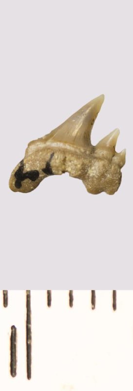 Зуб. Акула. Scapanorhynchus sp. Классификация: Хордовые Chordata, Позвоночные Vertebrata, Хрящевые рыбы Chondrichthyes, Пластиножаберные Elasmobranchii