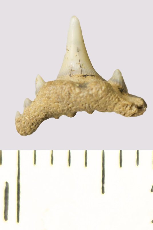 Зуб. Акула. Synechodus sp. Классификация: Хордовые Chordata, Позвоночные Vertebrata, Хрящевые рыбы Chondrichthyes, Пластиножаберные Elasmobranchii