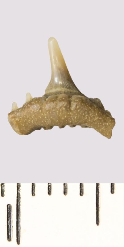 Зуб. Акула. Synechodus sp. Классификация: Хордовые Chordata, Позвоночные Vertebrata, Хрящевые рыбы Chondrichthyes, Пластиножаберные Elasmobranchii