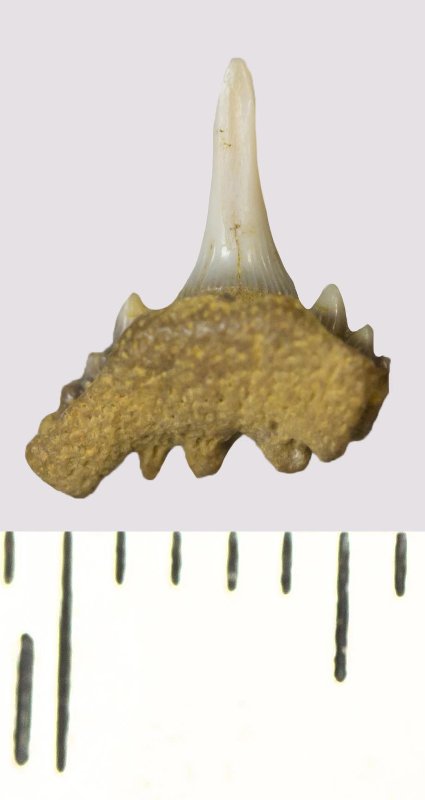 Зуб. Акула. Synechodus sp. Классификация: Хордовые Chordata, Позвоночные Vertebrata, Хрящевые рыбы Chondrichthyes, Пластиножаберные Elasmobranchii