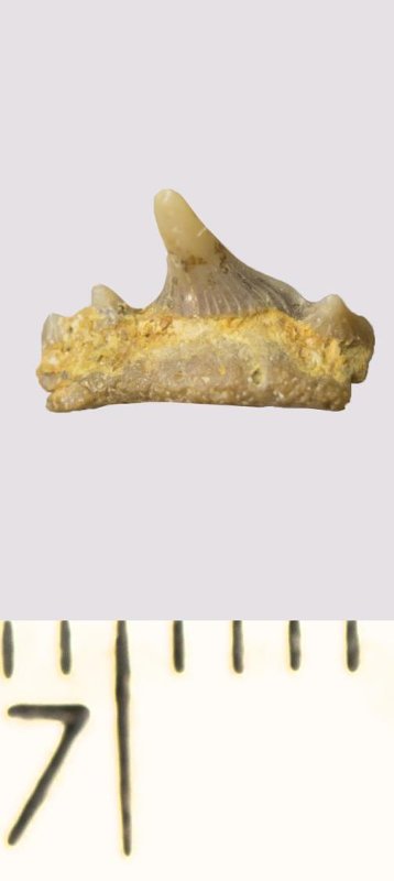 Зуб. Акула. Synechodus sp. Классификация: Хордовые Chordata, Позвоночные Vertebrata, Хрящевые рыбы Chondrichthyes, Пластиножаберные Elasmobranchii
