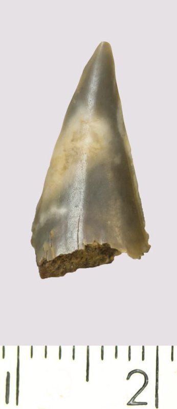 Зуб (фрагмент). Акула. Scapanorhynchus gigas Woodward, 1889. Классификация: Хордовые Chordata, Позвоночные Vertebrata, Хрящевые рыбы Chondrichthyes, Пластиножаберные Elasmobranchii
