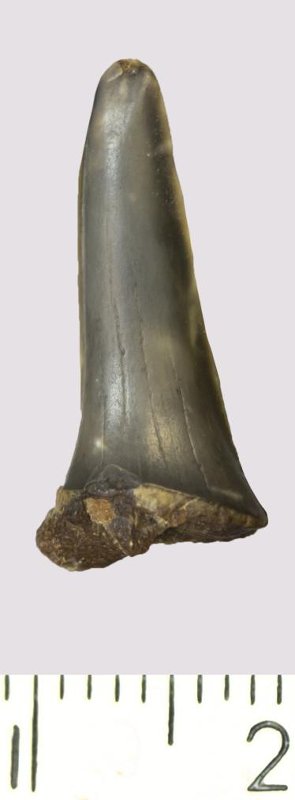 Зуб (фрагмент). Акула. Scapanorhynchus gigas Woodward, 1889. Классификация: Хордовые Chordata, Позвоночные Vertebrata, Хрящевые рыбы Chondrichthyes, Пластиножаберные Elasmobranchii