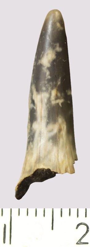 Зуб (фрагмент). Акула. Scapanorhynchus gigas Woodward, 1889. Классификация: Хордовые Chordata, Позвоночные Vertebrata, Хрящевые рыбы Chondrichthyes, Пластиножаберные Elasmobranchii