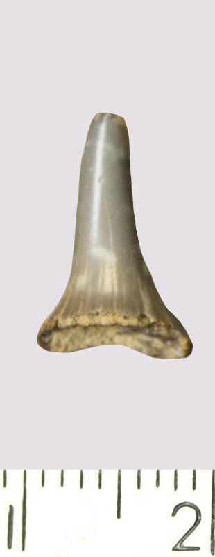 Зуб (фрагмент). Акула. Scapanorhynchus gigas Woodward, 1889. Классификация: Хордовые Chordata, Позвоночные Vertebrata, Хрящевые рыбы Chondrichthyes, Пластиножаберные Elasmobranchii