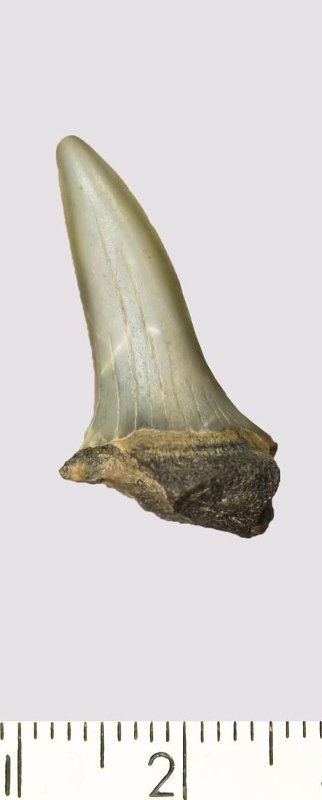 Зуб (фрагмент). Акула. Scapanorhynchus gigas Woodward, 1889. Классификация: Хордовые Chordata, Позвоночные Vertebrata, Хрящевые рыбы Chondrichthyes, Пластиножаберные Elasmobranchii