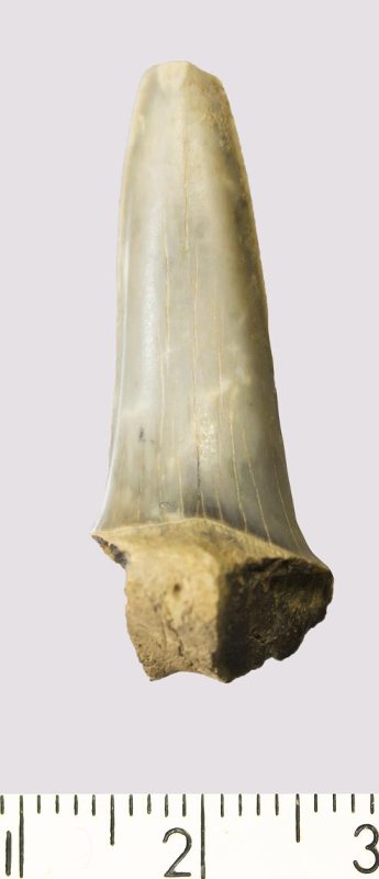 Зуб (фрагмент). Акула. Scapanorhynchus gigas Woodward, 1889. Классификация: Хордовые Chordata, Позвоночные Vertebrata, Хрящевые рыбы Chondrichthyes, Пластиножаберные Elasmobranchii