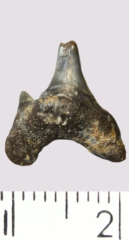 Зуб. Акула. Odontaspis macrorhiza (Cope) Leriche, 1902. Классификация: Хордовые Chordata, Позвоночные Vertebrata, Хрящевые рыбы Chondrichthyes, Пластиножаберные Elasmobranchii