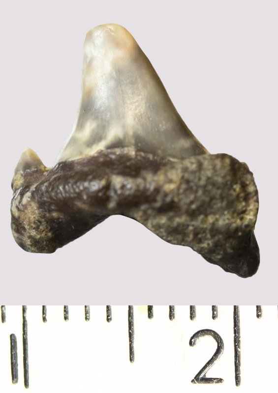Зуб. Акула. Odontaspis macrorhiza (Cope) Leriche, 1902. Классификация: Хордовые Chordata, Позвоночные Vertebrata, Хрящевые рыбы Chondrichthyes, Пластиножаберные Elasmobranchii