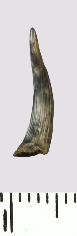 Зуб (фрагмент). Акула. Scapanorhynchus rhaphiodon Agassiz, 1843. Классификация: Хордовые Chordata, Позвоночные Vertebrata, Хрящевые рыбы Chondrichthyes, Пластиножаберные Elasmobranchii