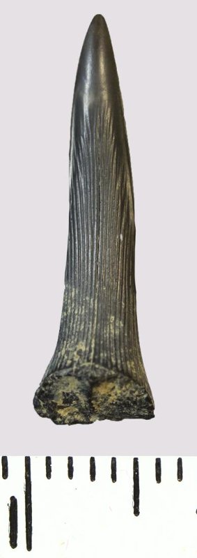 Зуб (фрагмент). Акула. Scapanorhynchus rhaphiodon Agassiz, 1843. Классификация: Хордовые Chordata, Позвоночные Vertebrata, Хрящевые рыбы Chondrichthyes, Пластиножаберные Elasmobranchii