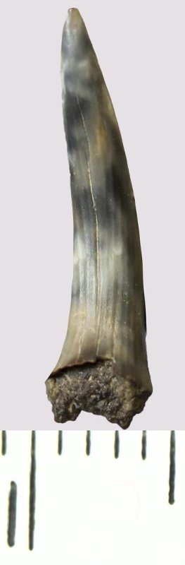 Зуб (фрагмент). Акула. Scapanorhynchus rhaphiodon Agassiz, 1843. Классификация: Хордовые Chordata, Позвоночные Vertebrata, Хрящевые рыбы Chondrichthyes, Пластиножаберные Elasmobranchii