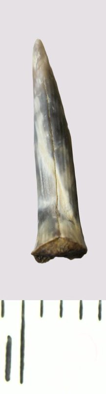 Зуб (фрагмент). Акула. Scapanorhynchus rhaphiodon Agassiz, 1843. Классификация: Хордовые Chordata, Позвоночные Vertebrata, Хрящевые рыбы Chondrichthyes, Пластиножаберные Elasmobranchii