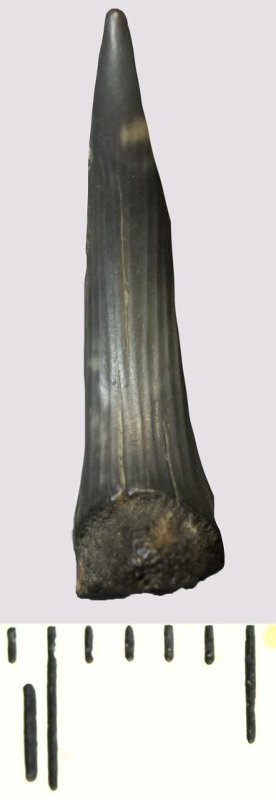 Зуб (фрагмент). Акула. Scapanorhynchus rhaphiodon Agassiz, 1843. Классификация: Хордовые Chordata, Позвоночные Vertebrata, Хрящевые рыбы Chondrichthyes, Пластиножаберные Elasmobranchii