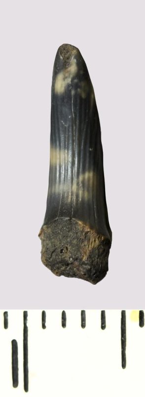 Зуб (фрагмент). Акула. Scapanorhynchus rhaphiodon Agassiz, 1843. Классификация: Хордовые Chordata, Позвоночные Vertebrata, Хрящевые рыбы Chondrichthyes, Пластиножаберные Elasmobranchii