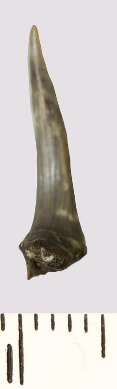 Зуб (фрагмент). Акула. Scapanorhynchus rhaphiodon Agassiz, 1843. Классификация: Хордовые Chordata, Позвоночные Vertebrata, Хрящевые рыбы Chondrichthyes, Пластиножаберные Elasmobranchii